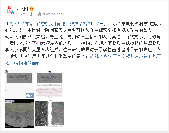 27日,国际科学期刊《科学·进展》在线发表了中国科学院国家天文台科研团队在月球深空探测领域取得的重大发现。该团队利用嫦娥四号玉兔二号月球车上搭载的测月雷达,首次揭示了月球背面着陆区域地下40米深度内的地质分层结构,发现地下物质由低损耗的月壤物质和大小不同的大量石块组成。这一研究成果对于了解撞击过程对月表的改造、火山活动规模与历史等具有非常重要的意义。