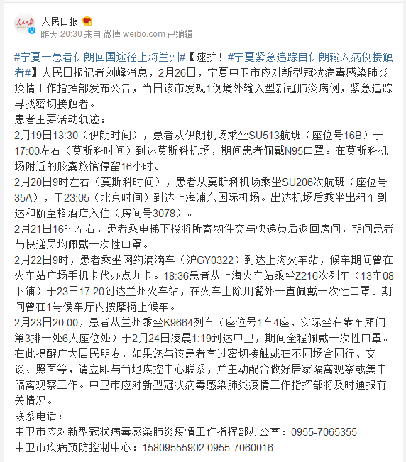 人民日报记者刘峰消息,2月26日,宁夏中卫市应对新型冠状病毒感染肺炎疫情工作指挥部发布公告,当日该市发现1例境外输入型新冠肺炎病例,紧急追踪寻找密切接触者。