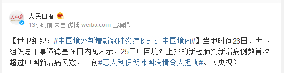 当地时间26日,世卫组织总干事谭德塞在日内瓦表示,25日中国境外上报的新冠肺炎新增病例数首次超过中国新增病例数,目前#意大利伊朗韩国病情令人担忧#。(央视)