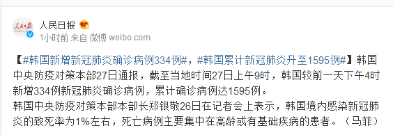 韩国中央防疫对策本部27日通报,截至当地时间27日上午9时,韩国较前一天下午4时新增334例新冠肺炎确诊病例,累计确诊病例达1595例。