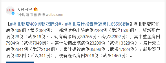 湖北新增确诊病例409例(武汉383例),新增治愈出院病例2288例(武汉1535例),新增死亡病例26例(武汉19例),现有确诊病例39755例(武汉32392例),其中重症病例7984例(武汉7049例)。累计治愈出院病例23200例(武汉13328例),累计死亡病例2641例(武汉2104例),累计确诊病例65596例(武汉47824例)。新增疑似病例403例(武汉341例),现有疑似病例2019例(武汉1459例)。