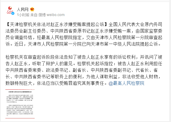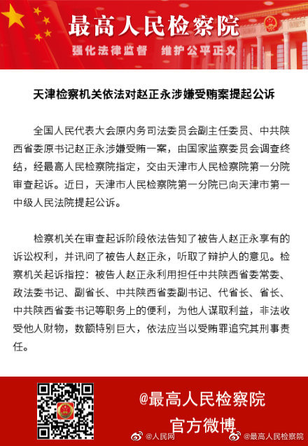 全国人民代表大会原内务司法委员会副主任委员、中共陕西省委原书记赵正永涉嫌受贿一案,由国家监察委员会调查终结,经最高人民检察院指定,交由天津市人民检察院第一分院审查起诉。近日,天津市人民检察院第一分院已向天津市第一中级人民法院提起公诉。