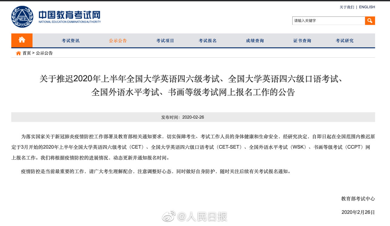 据教育部考试中心,自即日起在全国范围内推迟原定于3月开始的2020年上半年全国大学英语四六级考试、全国大学英语四六级口语考试、全国外语水平考试、书画等级考试网上报名工作,将据疫情防控的进展情况,动态更新并通知报名时间。