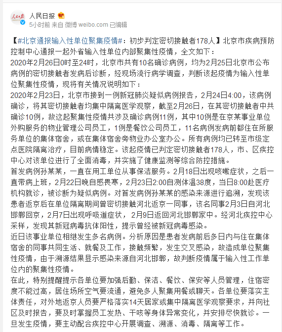 2020年2月26日0时至24时,北京市共有10名确诊病例,均为2月25日北京市公布病例的密切接触者发病后诊断,经现场流行病学调查,判断该起疫情为输入性单位聚集性疫情,现将有关情况说明如下: