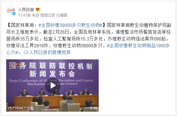 国家林草局野生动植物保护司副司长王维胜表示,截至2月26日,全国各地林草系统,清理整治市场餐馆饭店等经营场所35万多处,检查人工繁育场所15.3万多处,办理野生动物违法案件690起,收缴非法工具2919件,收缴野生动物39000多只,#全国收缴野生动物制品1800多公斤#。