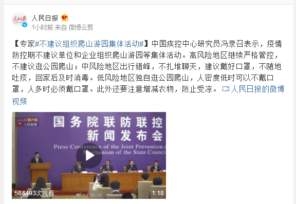 中国疾控中心研究员冯录召表示,疫情防控期不建议单位和企业组织爬山游园等集体活动。高风险地区继续严格管控,不建议逛公园爬山;中风险地区出行错峰,不扎堆聊天,建议戴好口罩,不随地吐痰,回家后及时消毒。低风险地区独自逛公园爬山,人密度低时可以不戴口罩,人多时必须戴口罩。此外还要注意增减衣物,防止受凉。