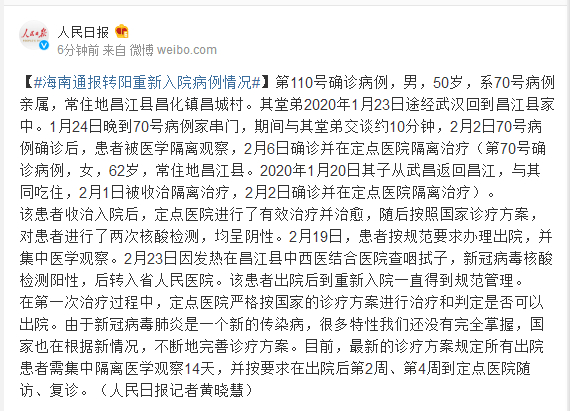 第110号确诊病例,男,50岁,系70号病例亲属,常住地昌江县昌化镇昌城村。其堂弟2020年1月23日途经武汉回到昌江县家中。1月24日晚到70号病例家串门,期间与其堂弟交谈约10分钟,2月2日70号病例确诊后,患者被医学隔离观察,2月6日确诊并在定点医院隔离治疗(第70号确诊病例,女,62岁,常住地昌江县。2020年1月20日其子从武昌返回昌江,与其同吃住,2月1日被收治隔离治疗,2月2日确诊并在定点医院隔离治疗)。