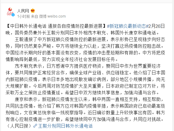 新冠肺炎最新动态#2月26日晚,国务委员兼外长王毅分别同日本外相茂木敏充、韩国外长康京和通电话。