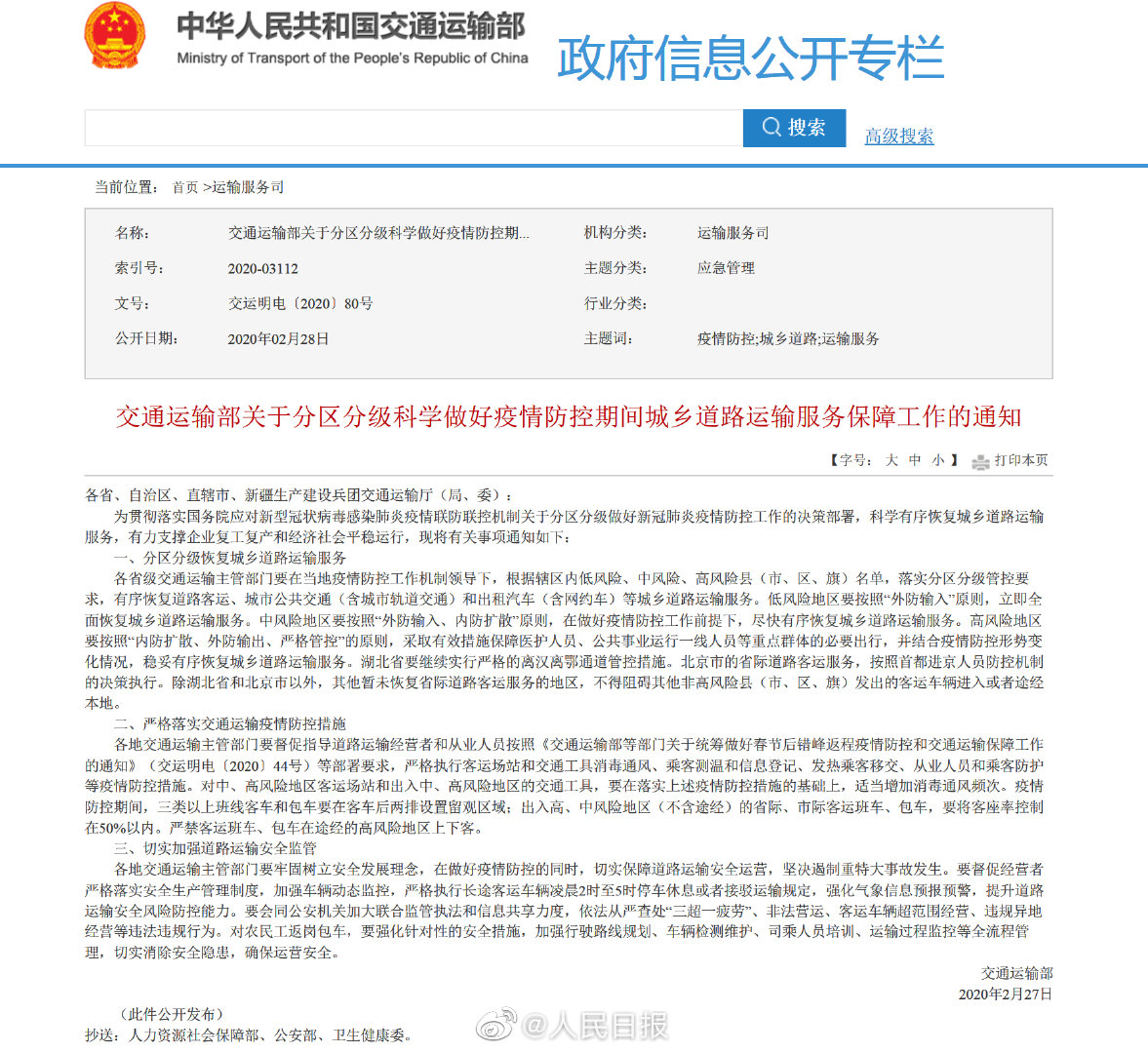 交通运输部印发通知,要求各省级交通运输主管部门要在当地疫情防控工作机制领导下,根据辖区内低风险、中风险、高风险县(市、区、旗)名单,落实分区分级管控要求,有序恢复道路客运、城市公共交通(含城市轨道交通)和出租汽车(含网约车)等城乡道路运输服务。湖北省要继续实行严格的离汉离鄂通道管控措施。北京市的省际道路客运服务,按照首都进京人员防控机制的决策执行。除湖北省和北京市以外,其他暂未恢复省际道路客运服务的地区,不得阻碍其他非高风险县(市、区、旗)发出的客运车辆进入或者途经本地。通知要求,出入高、中风险地区(不含途经)的省际、市际客运班车、包车,客座率要控制在50%以内。严禁客运班车、包车在途经的高风险地区上下客。