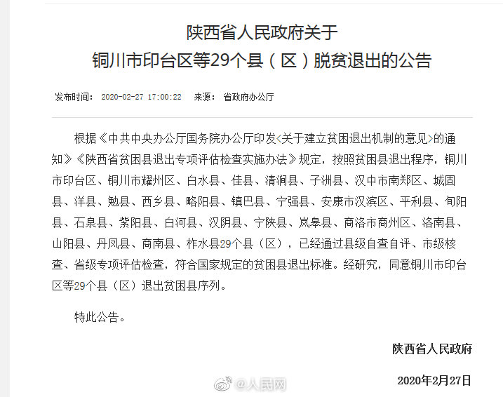 #决战2020#2月27日,陕西省政府批准铜川市印台区等29个贫困县(区)脱贫摘帽、退出贫困县序列。至此,陕西省56个贫困县全部脱贫摘帽,首次实现“见底清零”。这一目标实现,意味着陕西全省96.2%的贫困人口实现脱贫,区域性整体贫困基本解决,全省脱贫攻坚取得决定性胜利。