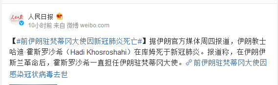据伊朗官方媒体周四报道,伊朗教士哈迪·霍斯罗沙希(Hadi Khosroshahi)在库姆死于新冠肺炎。报道称,在伊朗伊斯兰革命后,霍斯罗沙希一直担任伊朗驻梵蒂冈大使。