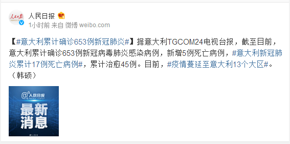 据意大利TGCOM24电视台报,截至目前,意大利累计确诊653例新冠病毒肺炎感染病例,新增5例死亡病例,#意大利新冠肺炎累计17例死亡病例#,累计治愈45例。目前,#疫情蔓延至意大利13个大区#。(韩硕)