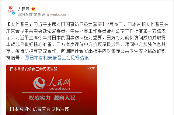 2月28日,日本首相安倍晋三在东京会见中共中央政治局委员、中央外事工作委员会办公室主任杨洁篪。安倍表示,习近平主席今年对日本的国事访问极为重要,日方将为确保访问成功并取得丰硕成果做好精心准备。日方高度评价中方抗疫积极成果,愿同中方加强信息共享、疫情防控等交流合作,向国际社会发出携手应对国际公共卫生安全挑战的积极信号。