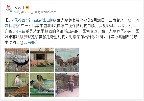 2月26日,云南普洱,@宁洱森林警察 在一村民家中查获4只国家二级保护动物白鹇,以及斑鸠、八哥。村民介绍,4只白鹇是从地里捡回的鸟蛋孵出来的,因为喜欢,当作宠物养了起来。因涉嫌非法驯养繁殖珍贵濒危野生动物,对李某作出行政处罚,并没收其圈养的野生动物。@云南警方