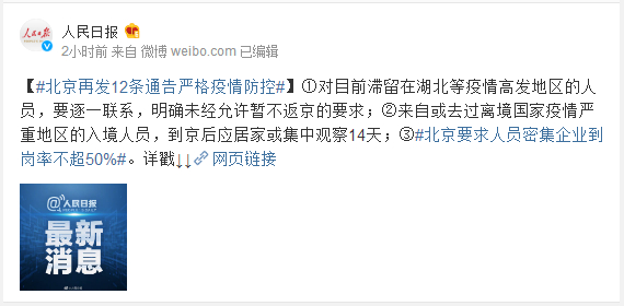 三、继续严格做好进(返)京人员管理。各单位对目前滞留在湖北等疫情高发地区的人员,要逐一联系,明确未经允许暂不返京的要求。对其他地区进(返)京人员,严格督促落实居家或集中观察14天有关规定,并配合居住地社区(村)做好防控工作,不得安排未完成居家或集中观察14天人员返岗工作。加强对外包服务单位的监督指导,督促严格执行人员进(返)京有关要求。来自或去过离境国家疫情严重地区的入境人员,到京后应居家或集中观察14天,严防疫情输入风险。