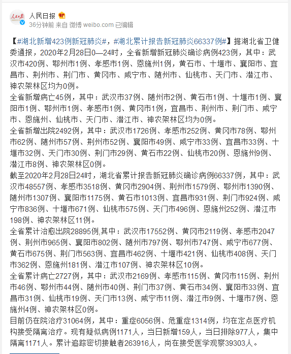 据湖北省卫健委通报,2020年2月28日0—24时,全省新增新冠肺炎确诊病例423例,其中:武汉市420例、鄂州市1例、孝感市1例、恩施州1例,黄石市、十堰市、襄阳市、宜昌市、荆州市、荆门市、黄冈市、咸宁市、随州市、仙桃市、天门市、潜江市、神农架林区均为0例。