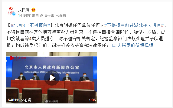 北京明确任何单位任何人#不得擅自前往湖北接人进京#,不得擅自前往其他地方接离鄂人员进京,不得擅自接全国确诊、疑似、发热、密切接触者等4类人员进京。对不遵守相关规定,纪检监察部门依规处理并予以通报。构成违反犯罪的,司法机关依法追究法律责任。