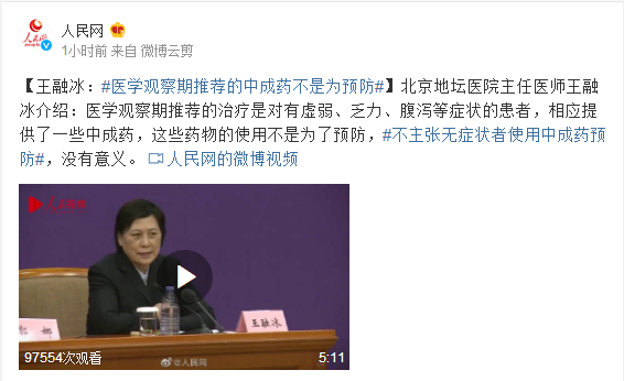 北京地坛医院主任医师王融冰介绍:医学观察期推荐的治疗是对有虚弱、乏力、腹泻等症状的患者,相应提供了一些中成药,这些药物的使用不是为了预防,#不主张无症状者使用中成药预防#,没有意义。