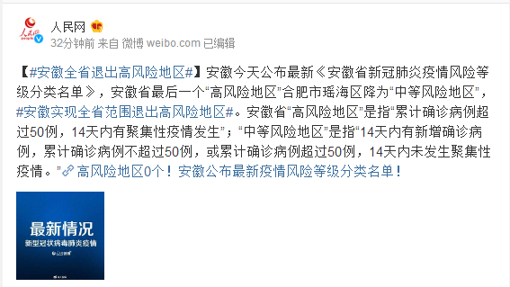 安徽今天公布最新《安徽省新冠肺炎疫情风险等级分类名单》,安徽省最后一个“高风险地区”合肥市瑶海区降为“中等风险地区”,#安徽实现全省范围退出高风险地区#。安徽省“高风险地区”是指“累计确诊病例超过50例,14天内有聚集性疫情发生”;“中等风险地区”是指“14天内有新增确诊病例,累计确诊病例不超过50例,或累计确诊病例超过50例,14天内未发生聚集性疫情。”高风险地区0个!安徽公布最新疫情风险等级分类名单!
