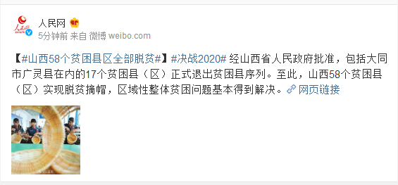 #决战2020# 经山西省人民政府批准,包括大同市广灵县在内的17个贫困县(区)正式退出贫困县序列。至此,山西58个贫困县(区)实现脱贫摘帽,区域性整体贫困问题基本得到解决。