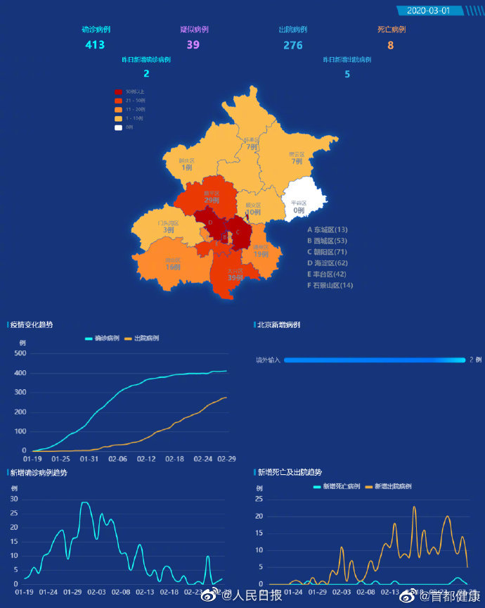 截至2月29日24时,累计确诊病例413例,治愈出院病例276例,死亡病例8例。现有疑似病例39例。累计确定密切接触者2690人,其中411人尚在隔离医学观察中。确诊病例中东城区13例、西城区53例、朝阳区71例、海淀区62例、丰台区42例、石景山区14例、门头沟区3例、房山区16例、通州区19例、顺义区10例、昌平区29例、大兴区39例、怀柔区7例、密云区7例、延庆区1例,外地来京人员25例,境外输入人员2例。平谷区尚未有病例。