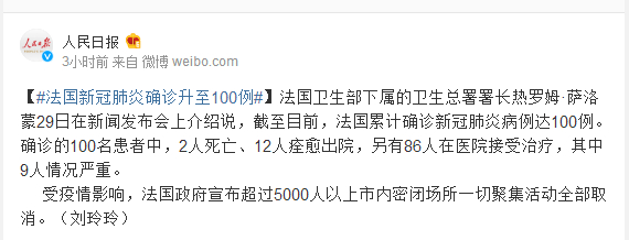 法国卫生部下属的卫生总署署长热罗姆·萨洛蒙29日在新闻发布会上介绍说,截至目前,法国累计确诊新冠肺炎病例达100例。确诊的100名患者中,2人死亡、12人痊愈出院,另有86人在医院接受治疗,其中9人情况严重。