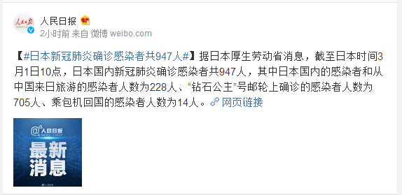 据日本厚生劳动省消息,截至日本时间3月1日10点,日本国内新冠肺炎确诊感染者共947人,其中日本国内的感染者和从中国来日旅游的感染者人数为228人、“钻石公主”号邮轮上确诊的感染者人数为705人、乘包机回国的感染者人数为14人。