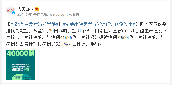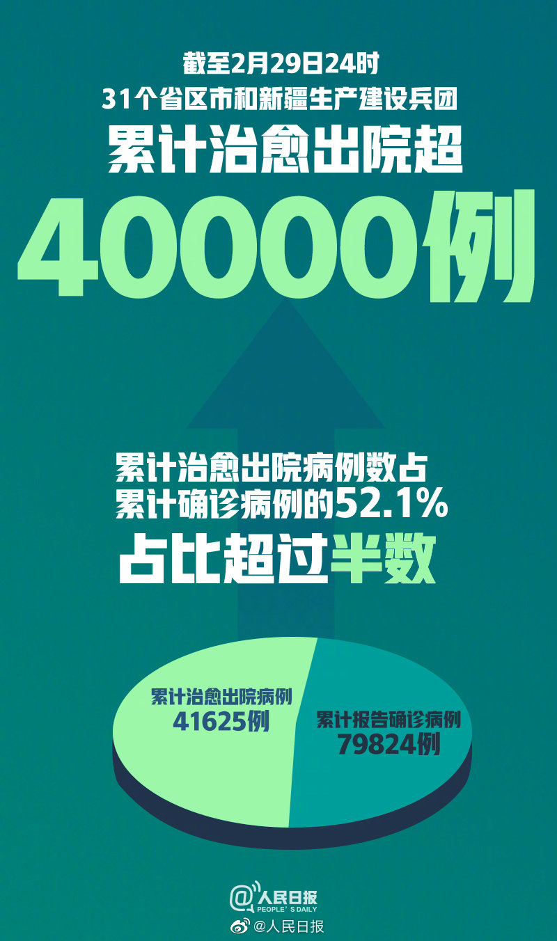 据国家卫健委通报的数据,截至2月29日24时,据31个省(自治区、直辖市)和新疆生产建设兵团报告,累计治愈出院病例41625例,累计报告确诊病例79824例。累计治愈出院病例数占累计确诊病例的52.1%,占比超过半数。