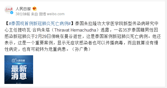 泰国朱拉隆功大学医学院新型传染病研究中心主任提叻瓦·合玛朱塔(Thiravat Hemachudha)透露,一名35岁泰国籍男性因感染新冠肺炎于2月29日傍晚在曼谷逝世,这是泰国首例新冠肺炎死亡病例。他还表示,这是一个重要案例,显示无症状感染者也可以传播病毒,而且就算没有慢性病史,也有可能转为危重病患。(孙广勇)