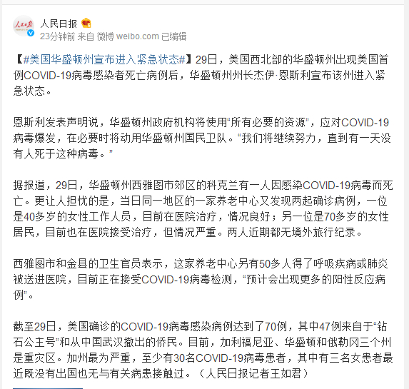 29日,美国西北部的华盛顿州出现美国首例COVID-19病毒感染者死亡病例后,华盛顿州州长杰伊·恩斯利宣布该州进入紧急状态。