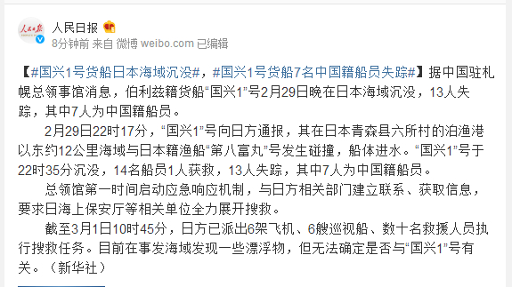 据中国驻札幌总领事馆消息,伯利兹籍货船“国兴1”号2月29日晚在日本海域沉没,13人失踪,其中7人为中国籍船员。