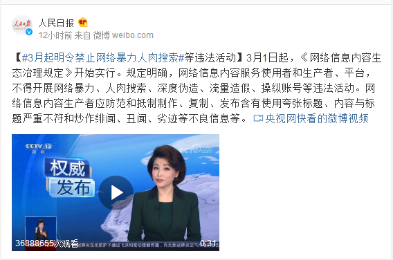 3月1日起,《网络信息内容生态治理规定》开始实行。规定明确,网络信息内容服务使用者和生产者、平台,不得开展网络暴力、人肉搜索、深度伪造、流量造假、操纵账号等违法活动。网络信息内容生产者应防范和抵制制作、复制、发布含有使用夸张标题、内容与标题严重不符和炒作绯闻、丑闻、劣迹等不良信息等。