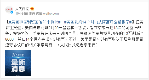 据美联社报道,美国与塔利班2月29日签署和平协议,旨在结束长达18年的阿富汗战争。根据协议,美军将在未来三到四个月,将驻阿美军规模从现在的1.3万削减至8600,并在14个月内完成全部撤军。不过,美军是否全部撤军取决于塔利班是否遵守协议中的相关承诺与否。(人民日报记者李志伟)