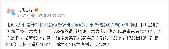 根据当地时间29日18时意大利卫生部公布的最近数据,意大利现有新冠病毒患者1049例,死亡29例,治愈50例,累计确诊感染新冠病毒总人数为1128例,较28日18时新增240例,其中重症105例,新增8例死亡病例。(韩硕)