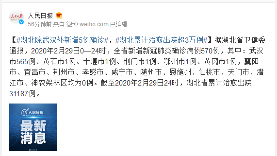 据湖北省卫健委通报,2020年2月29日0—24时,全省新增新冠肺炎确诊病例570例,其中:武汉市565例、黄石市1例、十堰市1例、荆门市1例、鄂州市1例、黄冈市1例,襄阳市、宜昌市、荆州市、孝感市、咸宁市、随州市、恩施州、仙桃市、天门市、潜江市、神农架林区均为0例。截至2020年2月29日24时,湖北省累计治愈出院31187例。