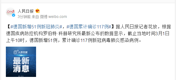 据人民日报记者花放,根据德国疾病防控机构罗伯特·科赫研究所最新公布的数据显示,截止当地时间3月1日上午10时,德国新增51例,累计确诊117例新冠病毒肺炎感染病例。