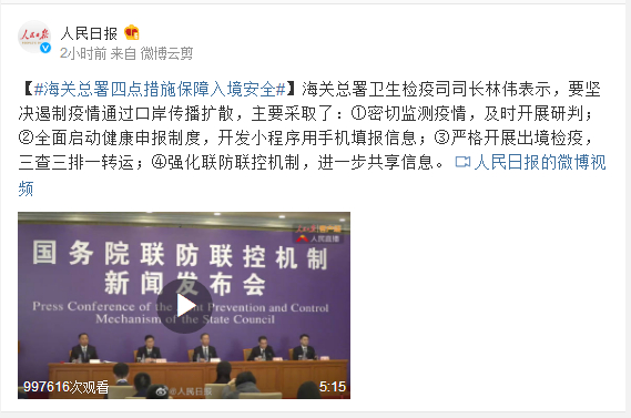 海关总署卫生检疫司司长林伟表示,要坚决遏制疫情通过口岸传播扩散,主要采取了:①密切监测疫情,及时开展研判;②全面启动健康申报制度,开发小程序用手机填报信息;③严格开展出境检疫,三查三排一转运;④强化联防联控机制,进一步共享信息。
