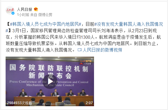 3月1日,国家移民管理局边防检查管理司司长刘海涛表示,从2月23日到现在,分析掌握的韩国公民来华入境日均1300人。航班满座是由于疫情发生后,航班数量压缩导致机票紧张。从韩国入境人员七成为中国内地居民。到目前为止,没有发现大量韩国人涌入我国情况。