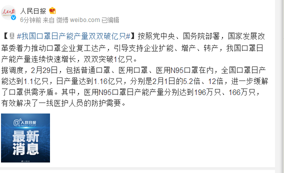 按照党中央、国务院部署,国家发展改革委着力推动口罩企业复工达产,引导支持企业扩能、增产、转产,我国口罩日产能产量连续快速增长,双双突破1亿只。
