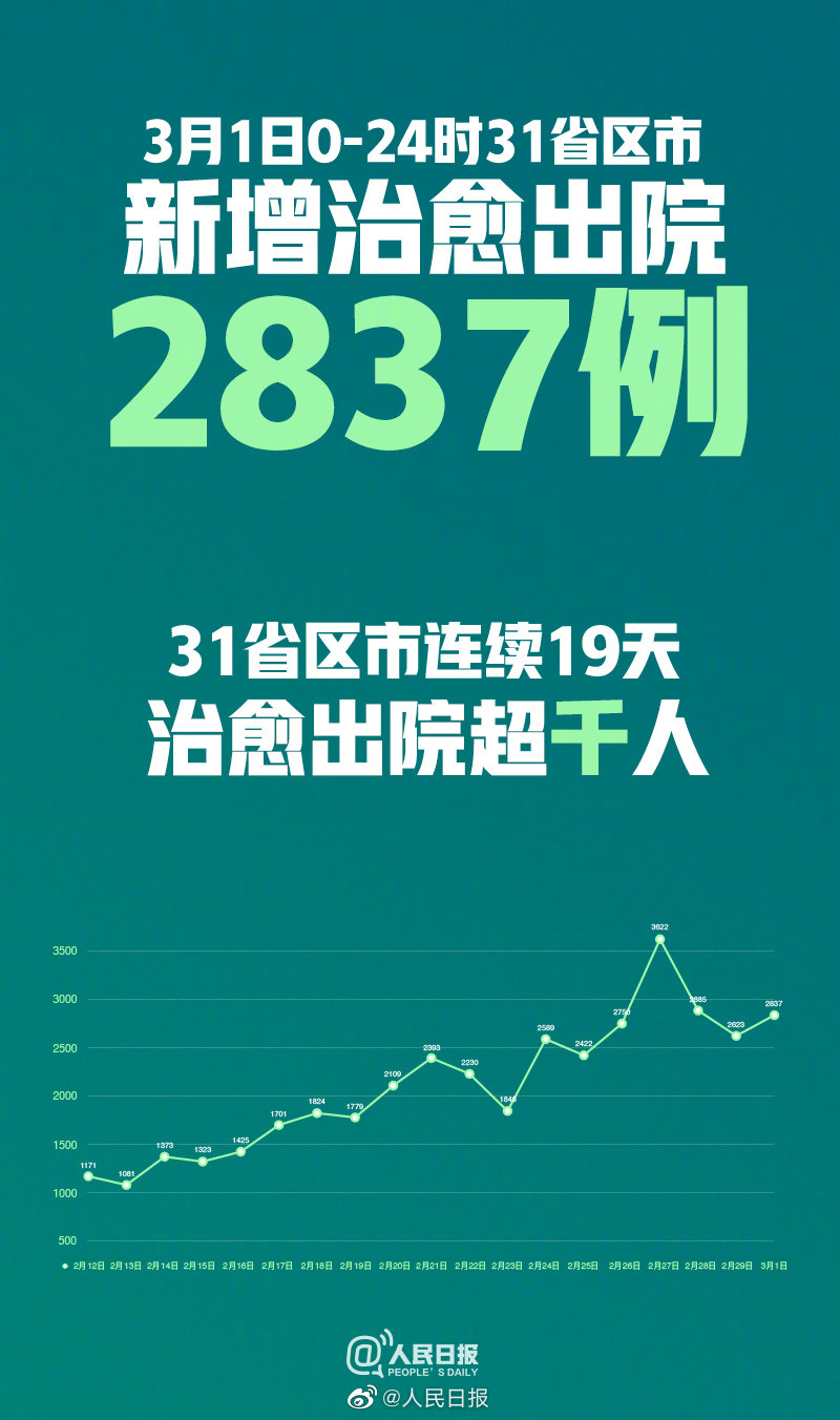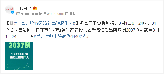 据国家卫健委通报,3月1日0—24时,31个省(自治区、直辖市)和新疆生产建设兵团新增治愈出院病例2837例。截至3月1日24时,全国#累计治愈出院病例44462例#。