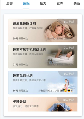 “行”模块里列出了很多针对不同健康维度的行动计划,如减肥方面的、心肺功能改善的、改善睡眠方面的等等。
