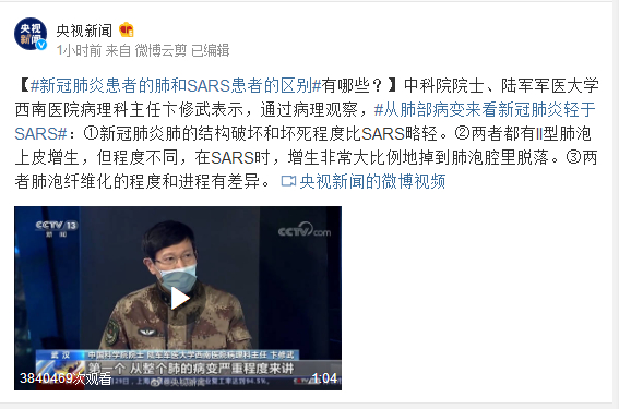 中科院院士、陆军军医大学西南医院病理科主任卞修武表示,通过病理观察,#从肺部病变来看新冠肺炎轻于SARS#:①新冠肺炎肺的结构破坏和坏死程度比SARS略轻。②两者都有II型肺泡上皮增生,但程度不同,在SARS时,增生非常大比例地掉到肺泡腔里脱落。③两者肺泡纤维化的程度和进程有差异。
