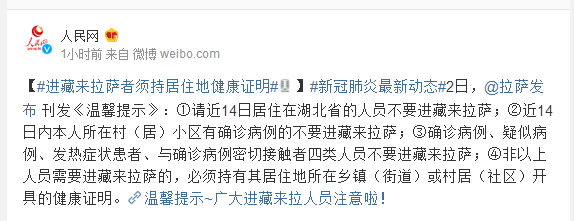 3月2日,@拉萨发布 刊发《温馨提示》:①请近14日居住在湖北省的人员不要进藏来拉萨;②近14日内本人所在村(居)小区有确诊病例的不要进藏来拉萨;③确诊病例、疑似病例、发热症状患者、与确诊病例密切接触者四类人员不要进藏来拉萨;④非以上人员需要进藏来拉萨的,必须持有其居住地所在乡镇(街道)或村居(社区)开具的健康证明。