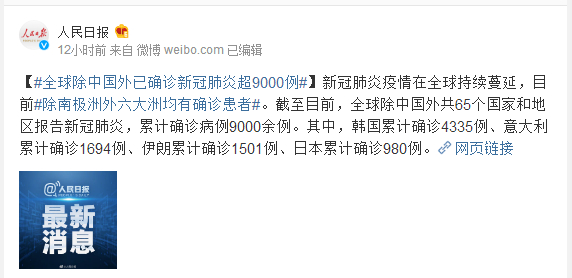 新冠肺炎疫情在全球持续蔓延,目前#除南极洲外六大洲均有确诊患者#。截至目前,全球除中国外共65个国家和地区报告新冠肺炎,累计确诊病例9000余例。其中,韩国累计确诊4335例、意大利累计确诊1694例、伊朗累计确诊1501例、日本累计确诊980例。