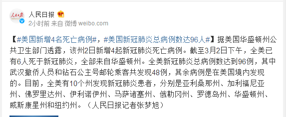 据美国华盛顿州公共卫生部门透露,该州2日新增4起新冠肺炎死亡病例。截至3月2日下午,全美已有6人死于新冠肺炎,全部来自华盛顿州。全美新冠肺炎总病例数达到96例,其中武汉撤侨人员和钻石公主号邮轮乘客共发现48例,其余病例是在美国境内发现的。目前,全美有10个州发现新冠肺炎患者,分别是亚利桑那州、加利福尼亚州、佛罗里达州、伊利诺伊州、马萨诸塞州、俄勒冈州、罗德岛州、华盛顿州、威斯康星州和纽约州。(人民日报记者张梦旭)