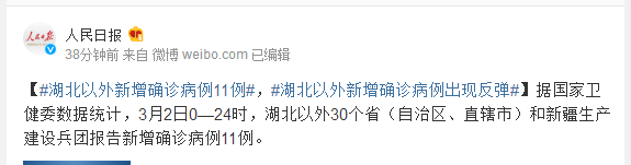 据国家卫健委数据统计,3月2日0—24时,湖北以外30个省(自治区、直辖市)和新疆生产建设兵团报告新增确诊病例11例。