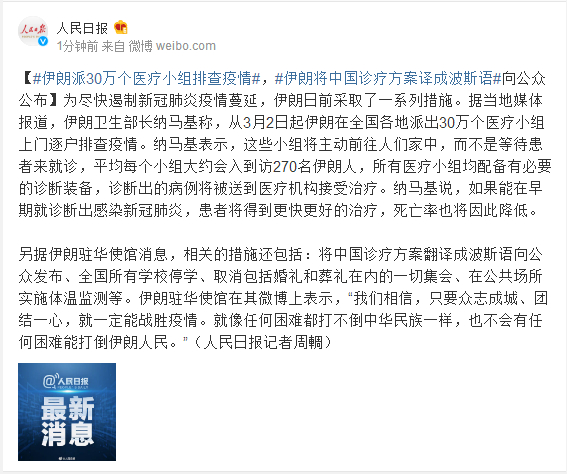 另据伊朗驻华使馆消息,相关的措施还包括:将中国诊疗方案翻译成波斯语向公众发布、全国所有学校停学、取消包括婚礼和葬礼在内的一切集会、在公共场所实施体温监测等。伊朗驻华使馆在其微博上表示,“我们相信,只要众志成城、团结一心,就一定能战胜疫情。就像任何困难都打不倒中华民族一样,也不会有任何困难能打倒伊朗人民。”(人民日报记者周輖)
