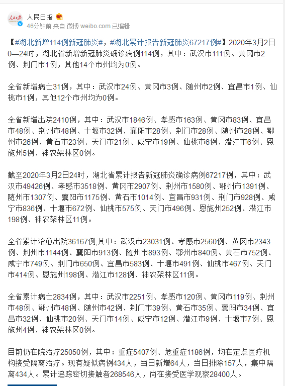 2020年3月2日0—24时,湖北省新增新冠肺炎确诊病例114例,其中:武汉市111例、黄冈市2例、荆门市1例,其他14个市州均为0例。