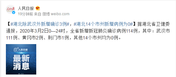 据湖北省卫健委通报,2020年3月2日0—24时,全省新增新冠肺炎确诊病例114例,其中:武汉市111例、黄冈市2例、荆门市1例,其他14个市州均为0例。