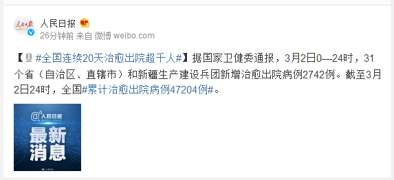 据国家卫健委通报,3月2日0—24时,31个省(自治区、直辖市)和新疆生产建设兵团新增治愈出院病例2742例。截至3月2日24时,全国#累计治愈出院病例47204例#。